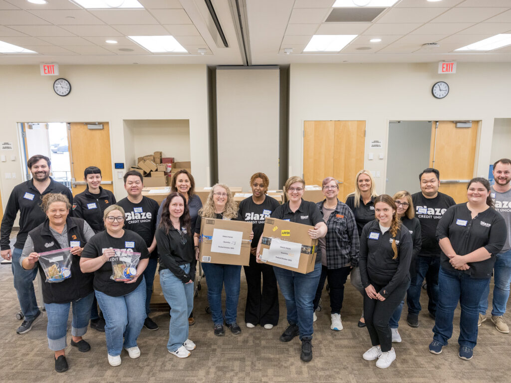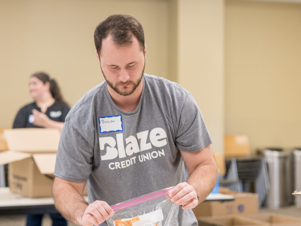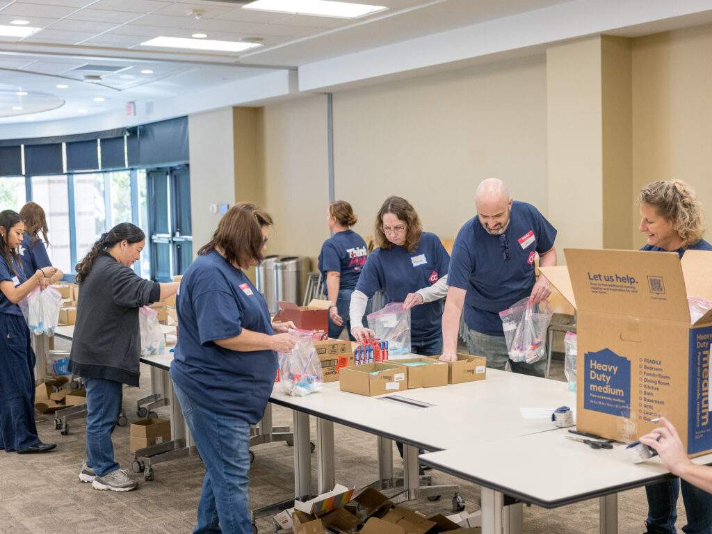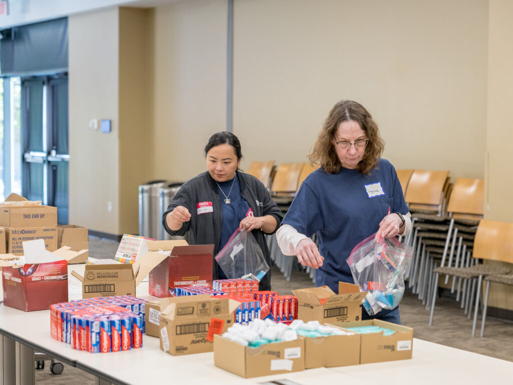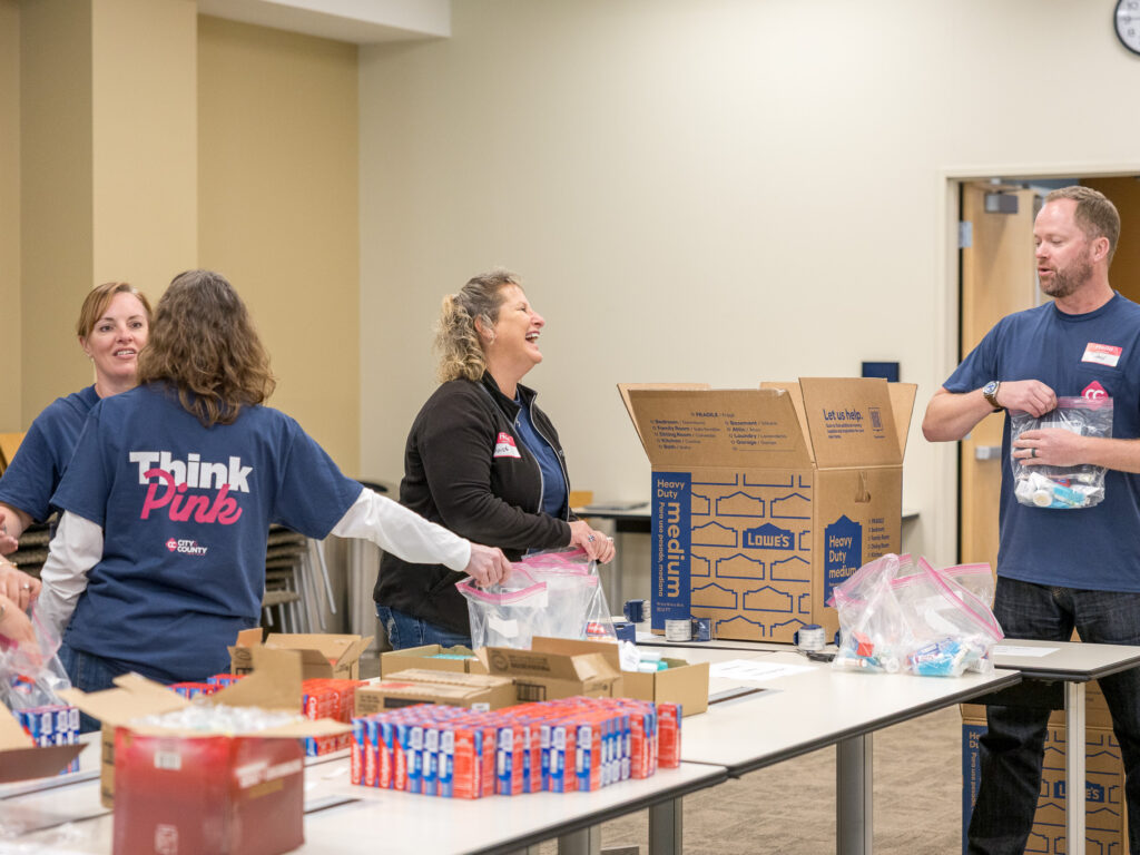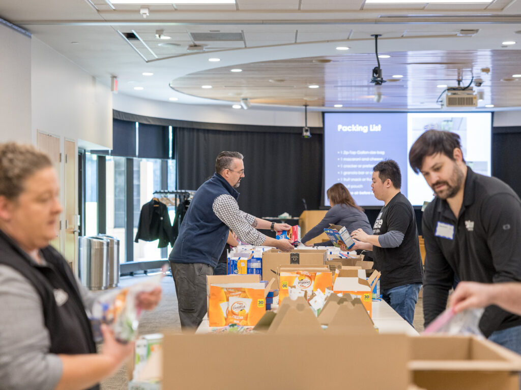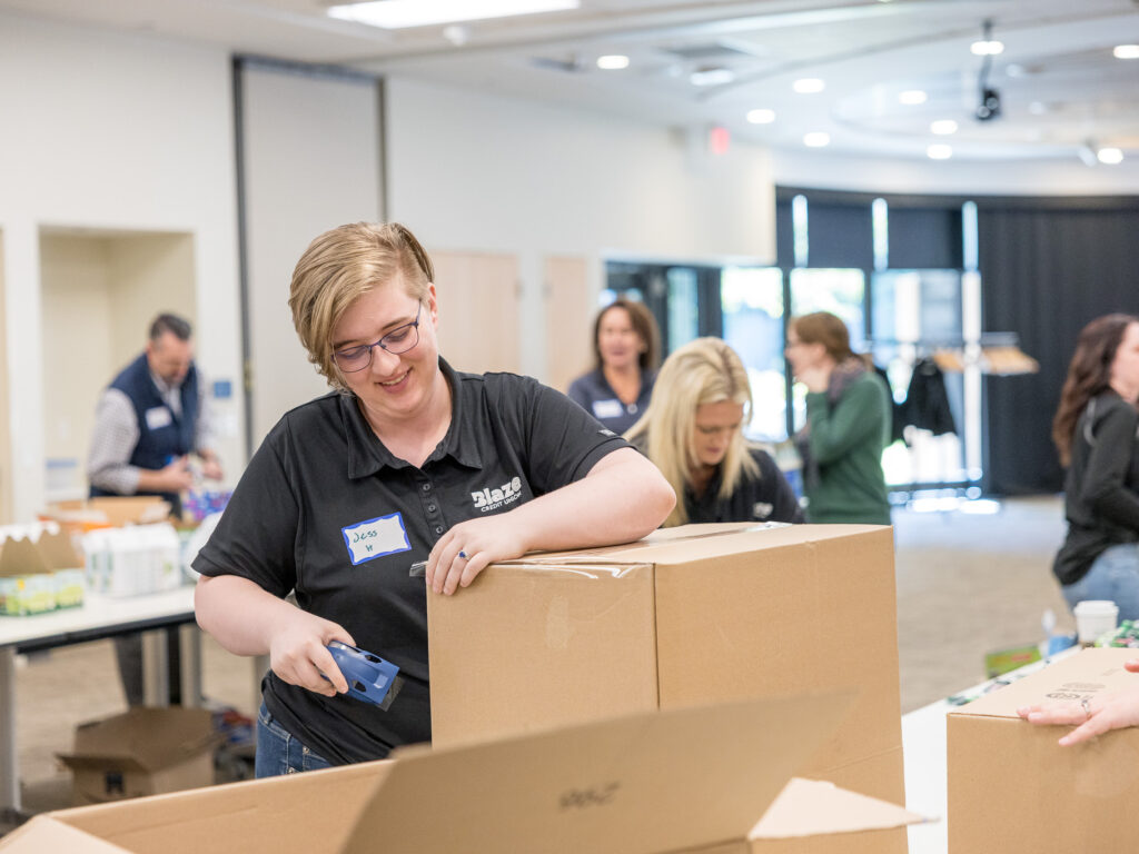 On a recent day at Wilder, teams from Blaze Credit Union and City & County Credit Union rolled up their sleeves to pack hygiene kits and snack packs for use across Wilder programs. The work was hands-on and collaborative—opening boxes, counting supplies, filling bags, and stacking finished kits, ready to be put to use.