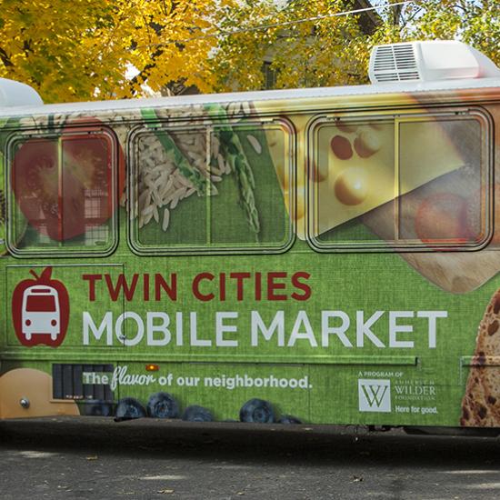 Twin Cities Mobile Market is a grocery store on a bus that brings affordable foods—such as fresh fruits, vegetables, meat, dairy and grains—directly to Twin Cities neighborhoods that don’t have nearby grocery stores or food shelves. It started five years ago as a Wilder program.